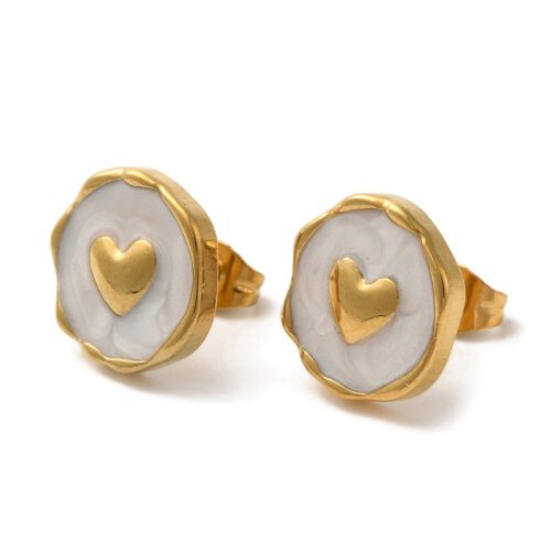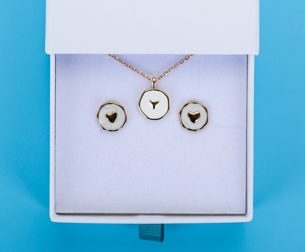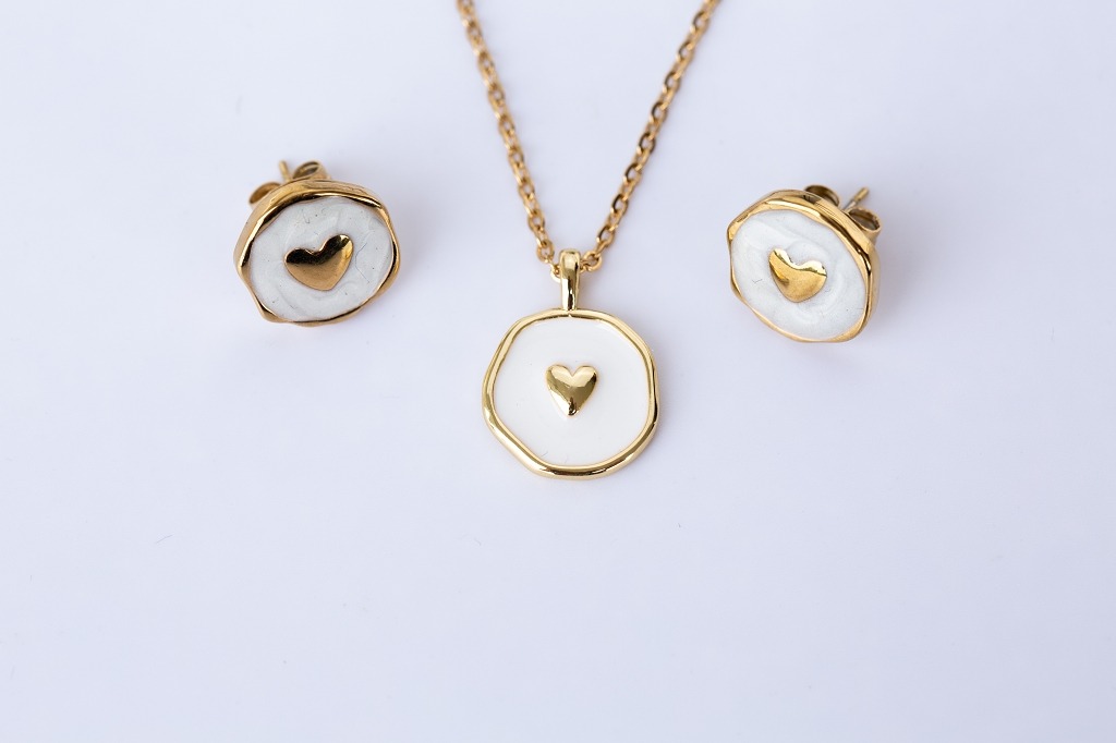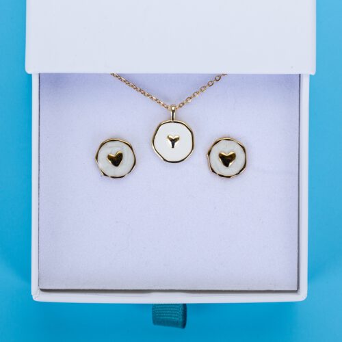 Edelstahl Set Kette und Ohrstecker Herz auf Emaille, weißVerfügbarkeit: Vorrätig